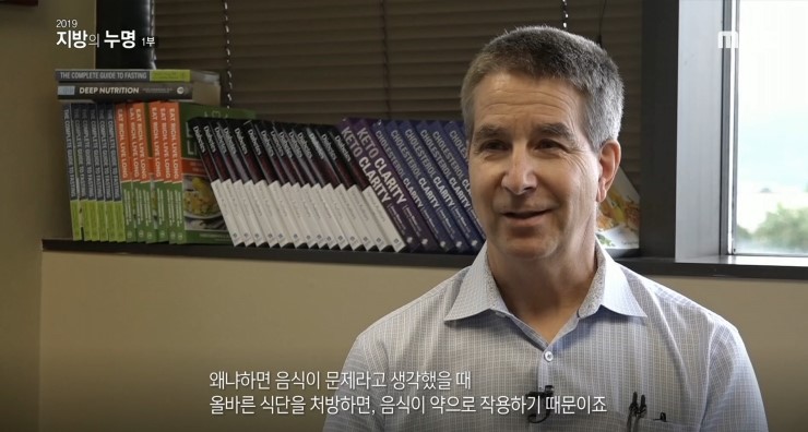 위 인터뷰에서 제프리 거버의 책장을 살펴볼까요? 맨 왼쪽에 제이슨 펑의 <독소를 비우는 몸 The Complete Guide to Fasting>이, 가운데에는 에릭 웨스트먼의 <지방을 태우는 몸 keto clarity>이 있네요.