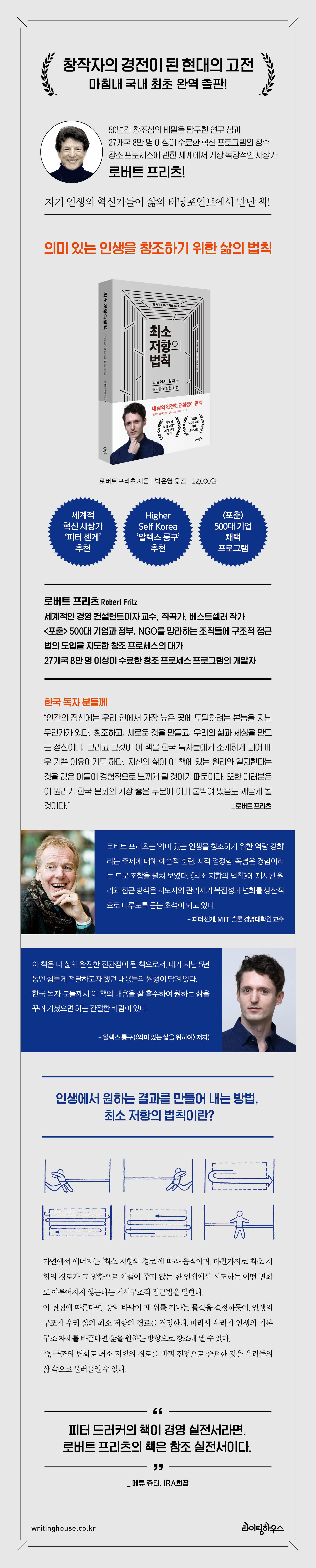 《최소 저항의 법칙》이 한국에서 출간된다는 소식을 듣고 저는 너무 기뻤습니다. 이 책은 제가 지난 5년 동안 힘들게 전달하고자 했던 내용들의 원형으로서 한국 독자분들께서 이 책의 내용을 잘 흡수하여 원하는 삶을 꾸려 가셨으면 하는 간절한 바람이 있습니다. 1980년대에 출간된 이 책은 ‘고생 문화’로 점철된 오늘날에 오히려 더욱 빛을 발하는 내용이라 생각합니다. 그 메시지는 오히려 그 어느 때보다 중요합니다. 차별, 경쟁, 학벌주의, 에고노믹스, 시기심이 조장되는 이 시대에 프리츠의 가르침은 우리 사회를 훨씬 더 조화로운 다음 단계로 안내할 것입니다.