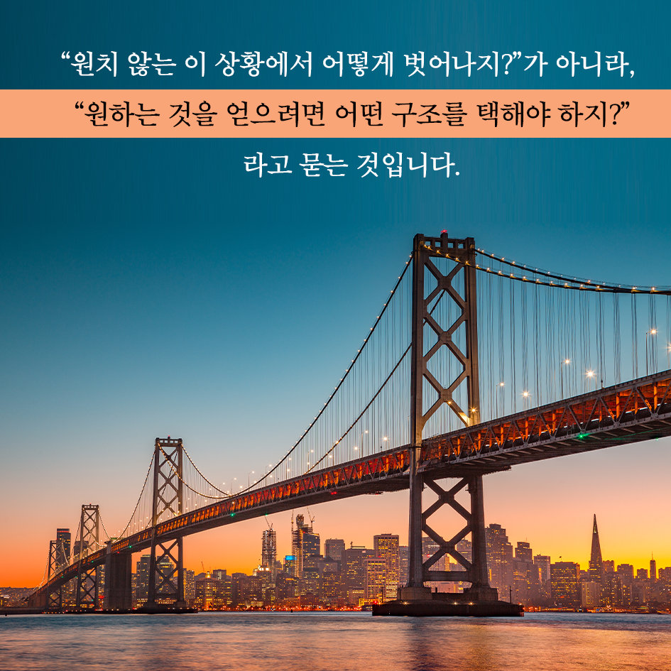 반대로 해소(resolution)의 구조는 우리를 최종 목적지로 이끌어 간다. 《최소 저항의 법칙》이 안내하는 창조 프로세스를 배우면 우리는 진동의 구조에서 벗어나 해소의 구조를 만들 수 있다. 구조적 사고법을 통해 우리는 먼저 제대로 된 질문을 할 수 있게 된다. ‘원치 않는 이 문제를 해결할 방법은 뭐지?’라고 묻는 대신, ‘내가 만들고 싶은 결과를 창조해 내려면 어떤 구조를 채택해야 하지?’라고 묻는 것이다. 즉, 문제 해결 지향성에서 창조 지향성으로 전환하게 된다. 이 작지만 획기적인 관점의 전환이 혁신의 시작이 된다.