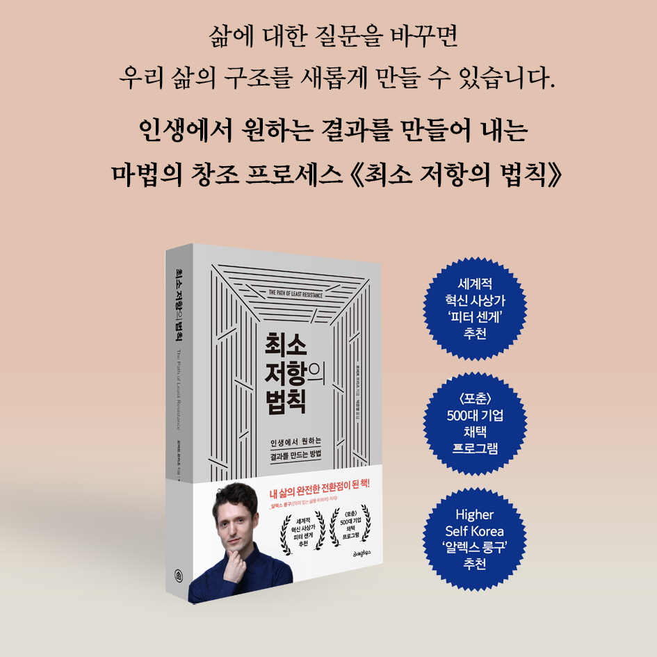 오늘날 창조성 분야에서 가장 독창적인 사상가 중 한 명인 로버트 프리츠의 대표작 《최소 저항의 법칙》이 국내 최초 완역 출간되었다. 피터 센게를 비롯한 경영 대가들의 참고도서 목록에서나 만날 수 있던 이 책은 창조적 삶을 살고자 하는 소수들로부터 조용하지만 강력한 지지를 받고 있었다. 마침내 선보이는 이번 한국어판은 한국 독자를 위한 저자의 특별 서문과 하이어셀프 대표 알렉스 룽구의 추천사를 수록하고 있다.