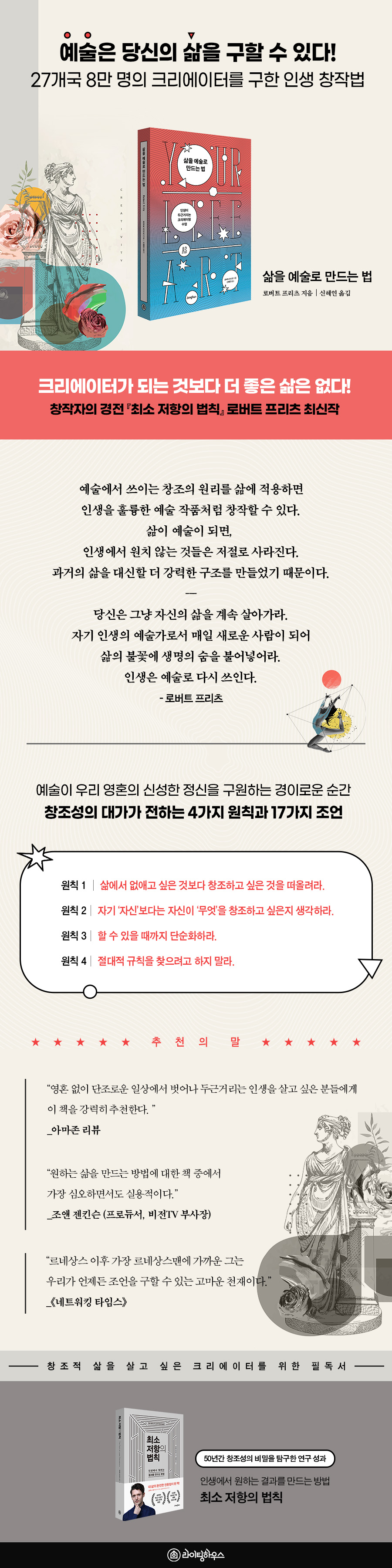저자 로버트 프리츠는 세계적 베스트셀러 《최소 저항의 법칙》 이후 꾸준히 발전시켜 온 창조성에 관한 자신만의 독창적 이론을 《삶을 예술로 만드는 법》에 이르러 원숙한 목소리로 유감없이 펼쳐 보인다.