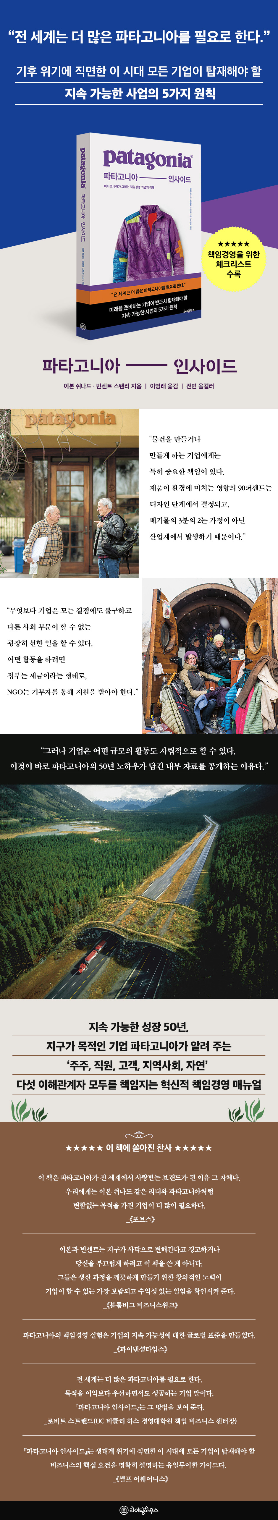 이 책은 파타고니아가 전 세계에서 사랑받는 브랜드가 된 이유 그 자체다. 우리에게는 이본 쉬나드 같은 리더와 파타고니아처럼 변함없는 목적을 가진 기업이 더 많이 필요하다.