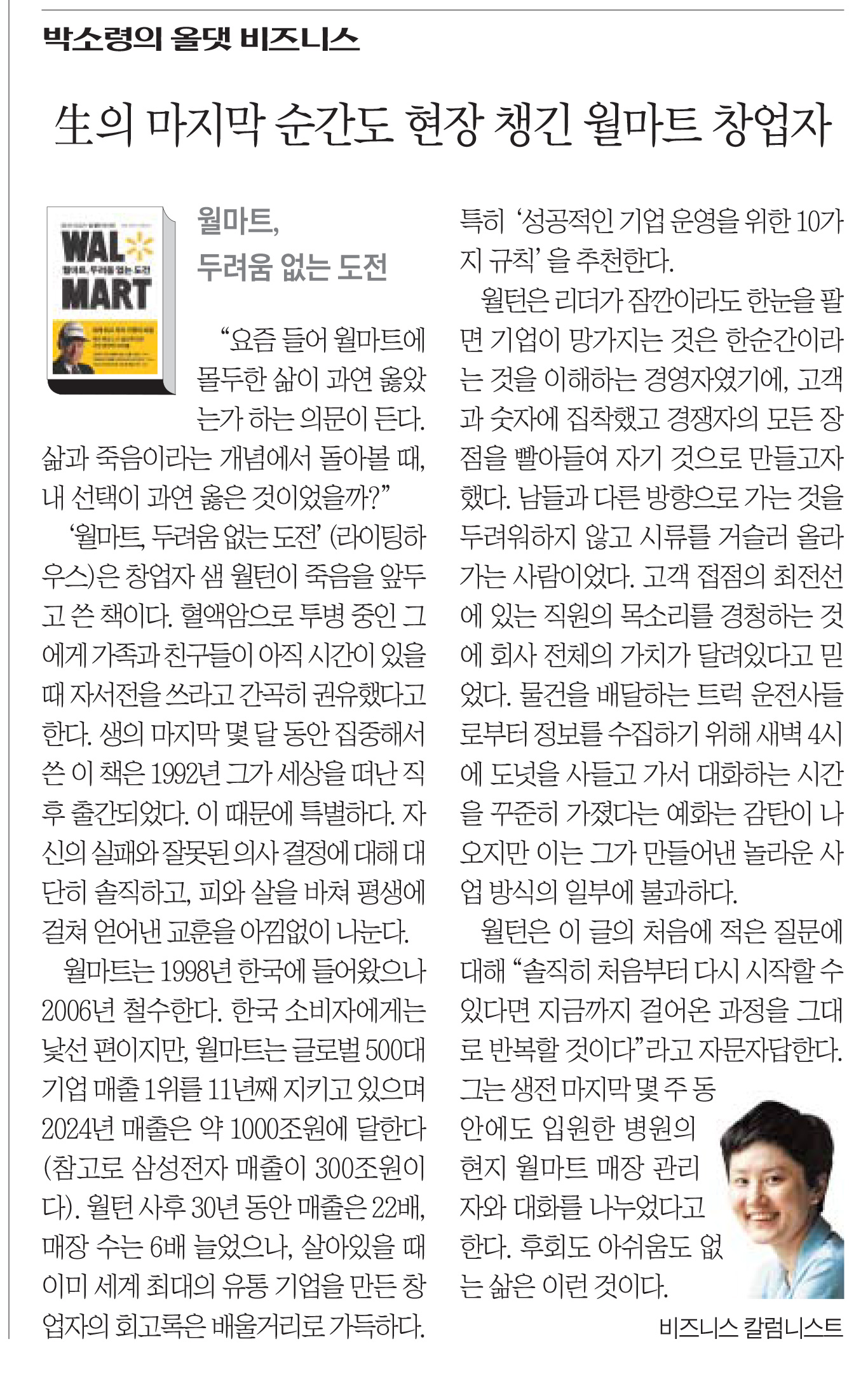 월마트는 1998년 한국에 들어왔으나 2006년 철수한다. 한국 소비자에게는 낯선 편이지만, 월마트는 글로벌 500대 기업 매출 1위를 11년째 지키고 있으며 2024년 매출은 약 1000조원에 달한다(참고로 삼성전자 매출이 300조원이다). 월턴 사후 30년 동안 매출은 22배, 매장 수는 6배 늘었으나, 살아있을 때 이미 세계 최대의 유통 기업을 만든 창업자의 회고록은 배울거리로 가득하다. 특히 ‘성공적인 기업 운영을 위한 10가지 규칙’을 추천한다. (중략)