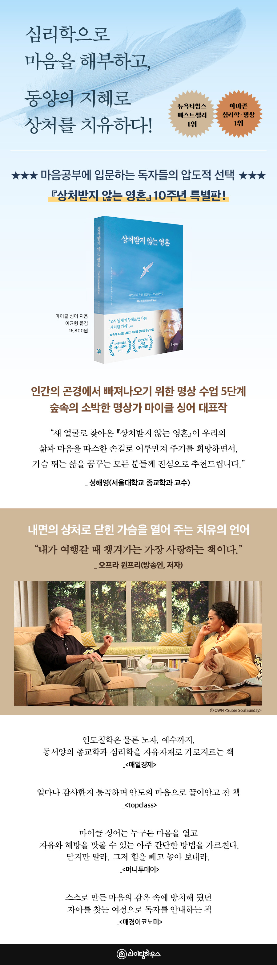 뉴욕타임스 베스트셀러 1위, 아마존 심리학 1위에 빛나는 마이클 싱어의 ‘The Untethered Soul’이 『상처받지 않는 영혼(라이팅하우스 발행)』이라는 제목으로 국내 출간된 지 10주년을 맞아 새로운 얼굴로 돌아왔다. 한국과 인연이 깊은 저자의 한국어판 서문과 성해영 교수의 감수와 함께 완전판으로 돌아온 이 작품은 오프라 윈프리가 ‘여행 갈 때 반드시 챙겨가야 할 책’으로 손꼽으며 유명해진 전설적인 심리 치유서이다. 역자는 추가되거나 누락된 원고의 번역과 함께 새로운 감각으로 작품 전체를 다듬어 완전판의 가치를 더했다. 지금도 여전히 아마존 분야 1위를 지키며 식을 줄 모르는 사랑을 받고 있는 이 책의 성공 비결은 외부의 조건에서 자신의 행복을 찾으려 했던 사람들의 시선을 각자의 내면으로 돌리게 한 데 있다. 그리고 그 작은 변화는 거대한 자기 혁명의 시작이 되었다.