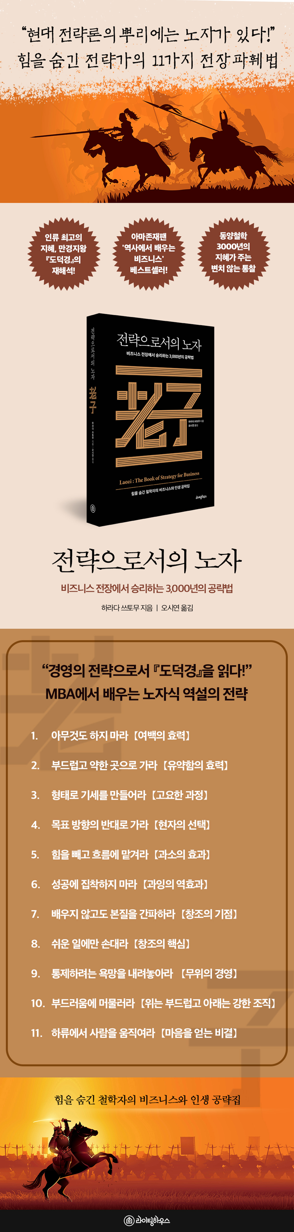 『전략으로서의 노자』를 통해 전략론의 관점에서 동양철학 3000년의 지혜를 돌아보는 일은, 대립하는 두 강대국 사이에서 선택을 강요받고 있는 작금의 현실에서도 조직과 개인에게 새로운 통찰과 활로의 가능성을 열어 줄 것이다.