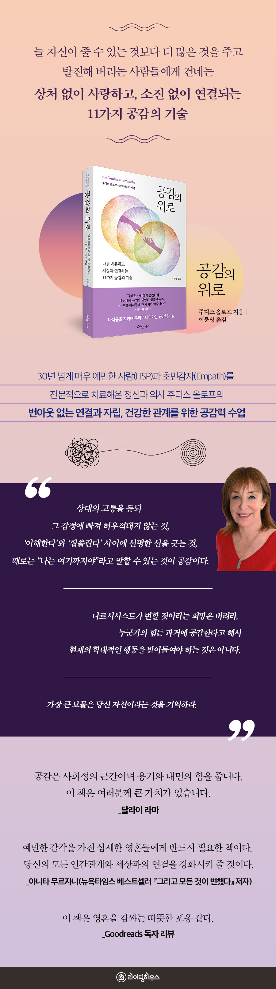 30년 넘게 ‘매우 예민한 사람(Highly Sensitive Person)’들과 타인의 감정을 스펀지처럼 흡수하는 ‘초민감자(empath)’들을 전문적으로 치료해온 정신과의사 주디스 올로프는 인간의 불안과 고독, 고통을 달래주는 치료제가 있다면 그건 ‘공감’이라고 말한다. 단, 공감이 치유가 되기 위해서는 타인의 감정에 과도하게 동일시되지 않는 ‘자기 공감의 기술’이 필요하다. 저자가 말하는 자기 공감이란 어떤 상황에서도 스스로를 먼저 돌보고 타인과 나 사이에 분명한 경계를 세우는 것이다. 공감하되 자기 감정을 소진하지 않고, 때로 “나는 여기까지야”라고 말할 수 있어야 나도 행복하고 서로에게 도움이 되는 건강한 공감을 할 수 있다고 저자는 말한다.