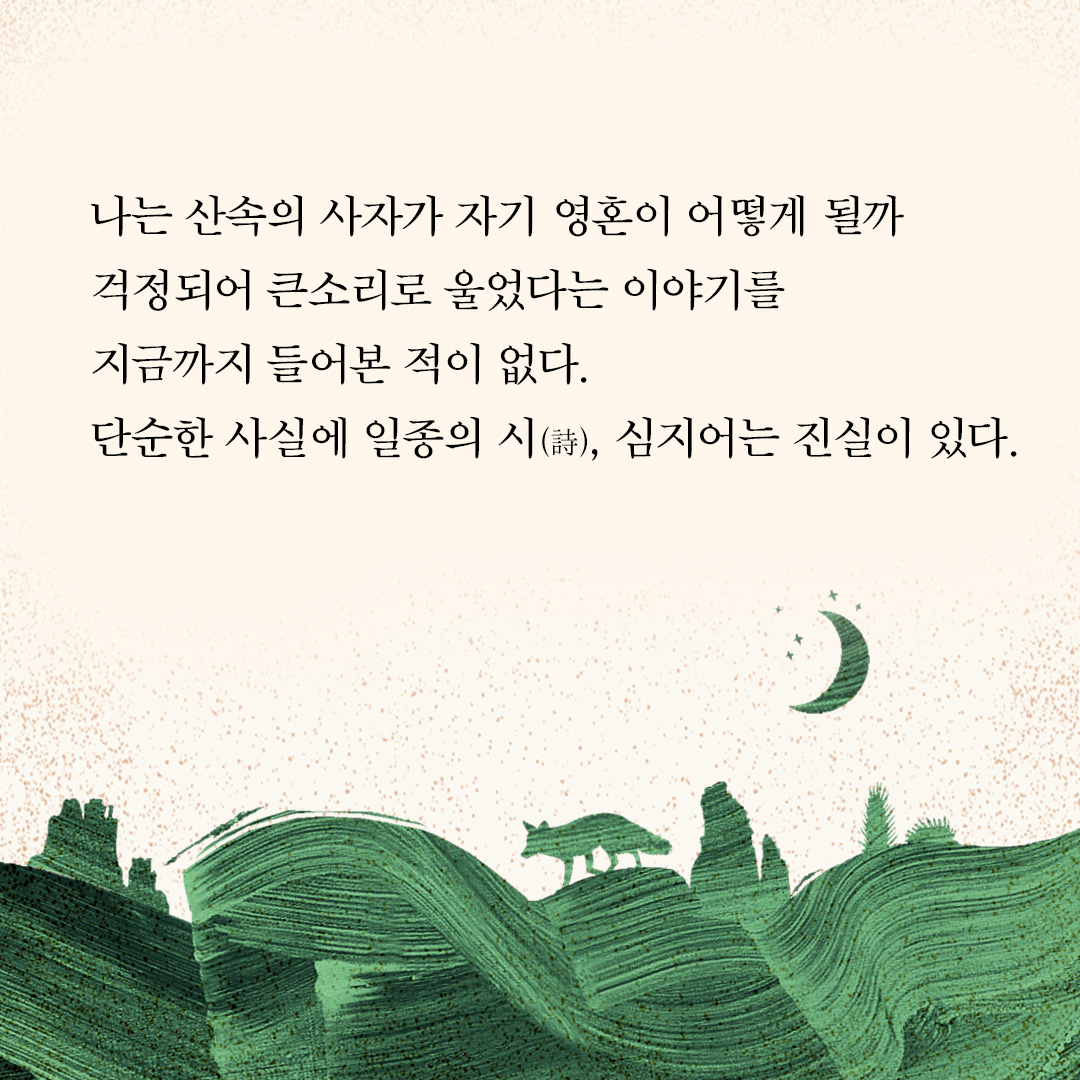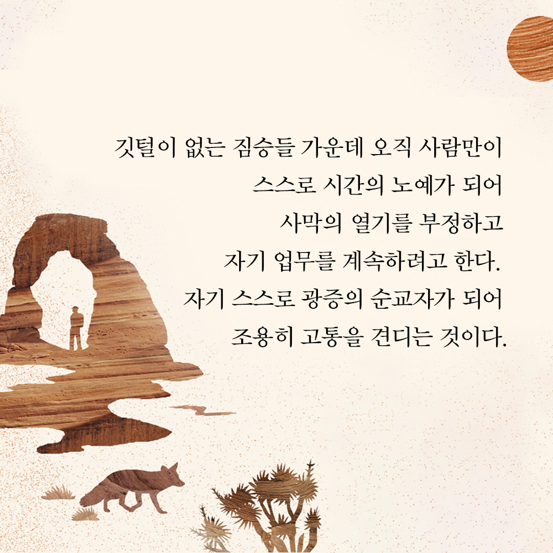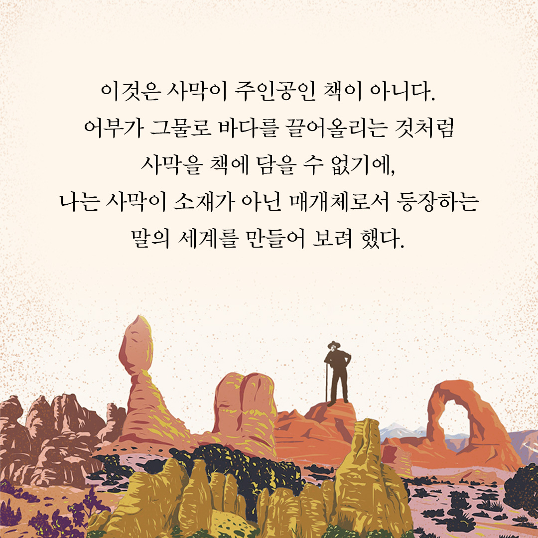 이것은 사막이 주인공인 책이 아니다. 자연 경관에 대한 인상을 기록할 때면 나는 무엇보다도 정확성을 위해 노력했다. 단순한 사실에 일종의 시(詩), 심지어는 진실이 있다고 믿기 때문이다. 하지만 사막은 바다만큼이나 깊고 복잡하고 다양하며 광활한 세계다. 대양과 같은 세계다. 무한한 사실들 속에서, 언어는 단순한 사실을 포착하기 위해 강력하고도 느슨한 그물을 만든다. 만약 내가 향나무에 대해 충분히 알고 있다면 한 권의 책을 쓸 수 있을 것이다. 일반적인 향나무가 아니라 아치스 내셔널 모뉴먼트의 오래된 입구 근처 벌거벗은 사암 바위틈에서 자라는 하나의 특별한 향나무 말이다. 그때 내가 시도한 것은 조금 다른 것이었다. 어부가 그물로 바다를 끌어올리는 것처럼, 사막을 책에 담을 수는 없기에 나는 사막이 소재가 아닌 매개체로서 등장하는 말의 세계를 만들어 보려고 했다. 그러니까 모방이 아니라 환기가 목표였다.