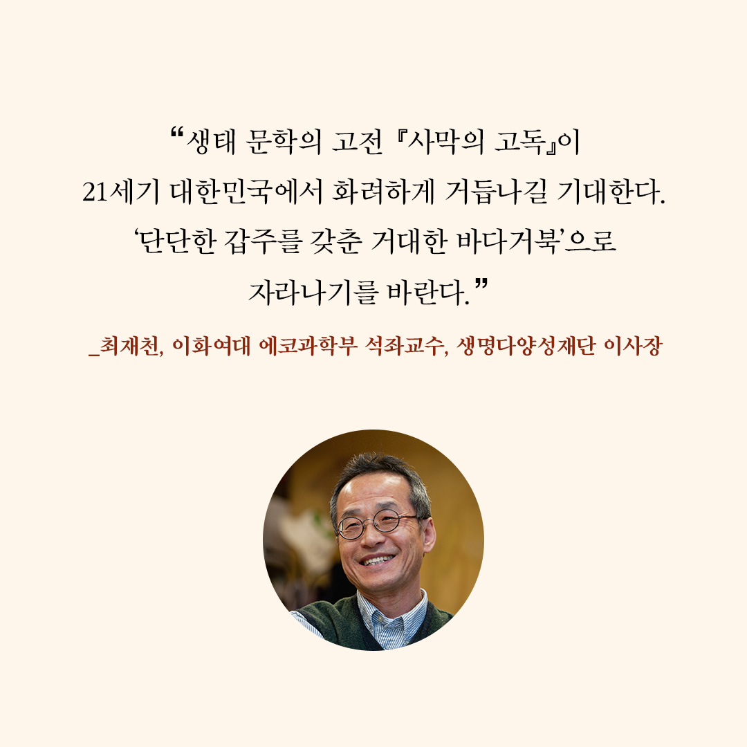 ‘모든 책은 알에서 갓 깨어난 거북이 새끼처럼 자신의 일생을 시작한다’는 저자의 말처럼 책은 그 자체로 살아 있는 생명체다. 나는 1968년에 처음 출간된 미국 생태 문학의 고전 『사막의 고독』이 21세기 대한민국에서 화려하게 거듭나길 기대한다. ‘단단한 갑주를 갖춘 거대한 바다거북’으로 자라나기를 바란다. _ 최재천, 이화여대 에코과학부 석좌교수, 생명다양성재단 이사장